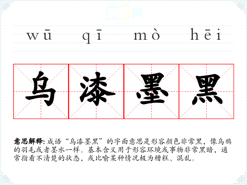 成语“乌漆墨黑”的字面意思是形容颜色非常黑,像乌鸦的羽毛或者墨水一样。基本含义用于形容环境或事物非常黑暗,通常指看不清楚的状态,或比喻某种情况极为糟糕、混乱。