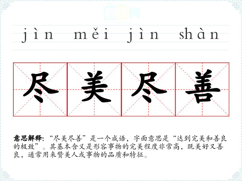 “尽美尽善”是一个成语,字面意思是“达到完美和善良的极致”。其基本含义是形容事物的完美程度非常高,既美好又善良,通常用来赞美人或事物的品质和特征。