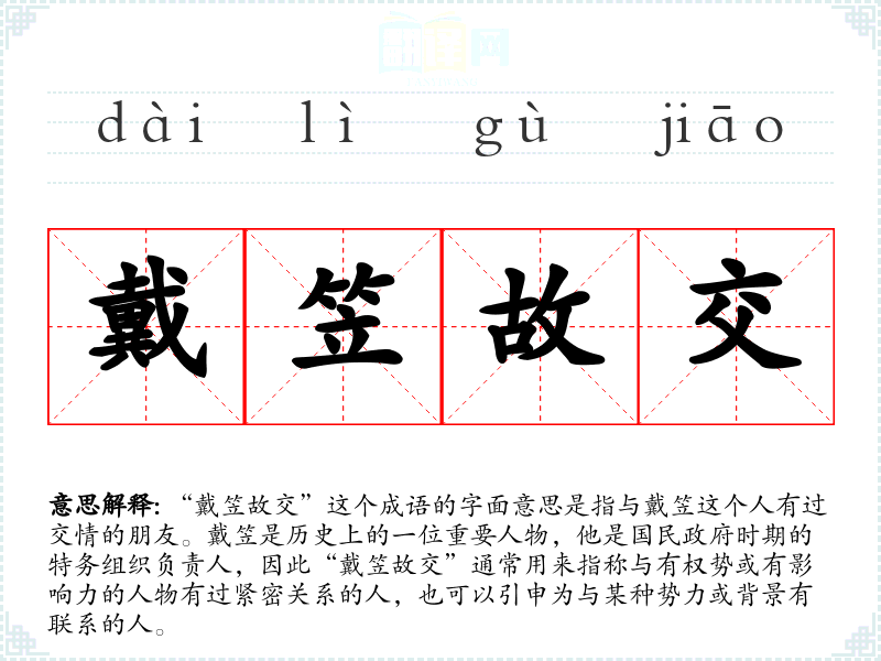“戴笠故交”这个成语的字面意思是指与戴笠这个人有过交情的朋友。戴笠是历史上的一位重要人物,他是国民政府时期的特务组织负责人,因此“戴笠故交”通常用来指称与有权势或有影响力的人物有过紧密关系的人,也可以引申为与某种势力或背景有联系的人。