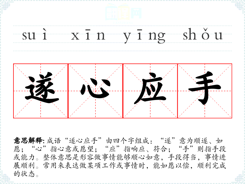 成语“遂心应手”由四个字组成:“遂”意为顺遂、如愿;“心”指心意或愿望;“应”指响应、符合;“手”则指手段或能力。整体意思是形容做事情能够顺心如意,手段得当,事情进展顺利。常用来表达做某项工作或事情时,能如愿以偿,顺利完成的状态。