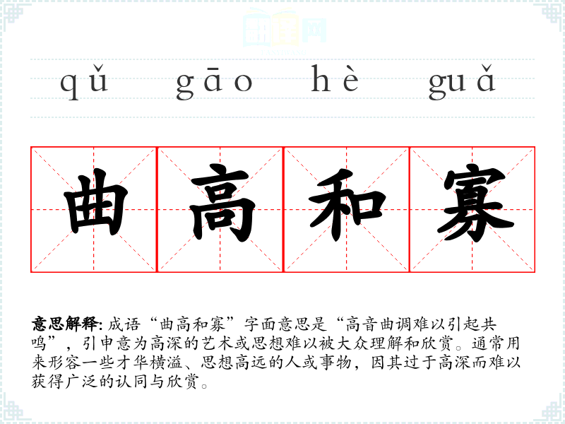 成语“曲高和寡”字面意思是“高音曲调难以引起共鸣”,引申意为高深的艺术或思想难以被大众理解和欣赏。通常用来形容一些才华横溢、思想高远的人或事物,因其过于高深而难以获得广泛的认同与欣赏。