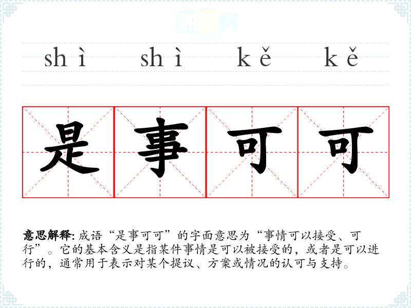 成语“是事可可”的字面意思为“事情可以接受、可行”。它的基本含义是指某件事情是可以被接受的,或者是可以进行的,通常用于表示对某个提议、方案或情况的认可与支持。