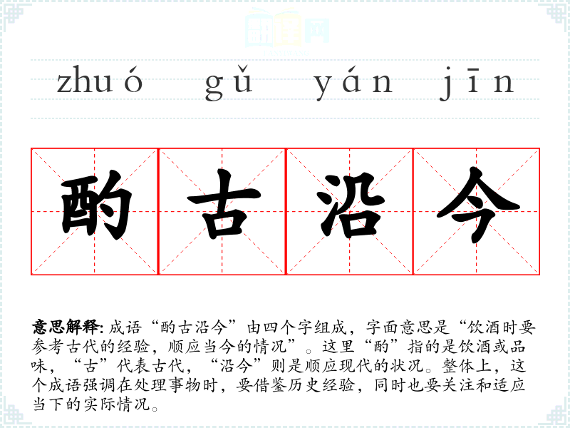 成语“酌古沿今”由四个字组成,字面意思是“饮酒时要参考古代的经验,顺应当今的情况”。这里“酌”指的是饮酒或品味,“古”代表古代,“沿今”则是顺应现代的状况。整体上,这个成语强调在处理事物时,要借鉴历史经验,同时也要关注和适应当下的实际情况。