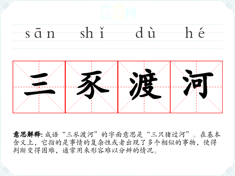 成语“三豕渡河”的字面意思是“三只猪过河”。在基本含义上,它指的是事情的复杂性或者出现了多个相似的事物,使得判断变得困难,通常用来形容难以分辨的情况。