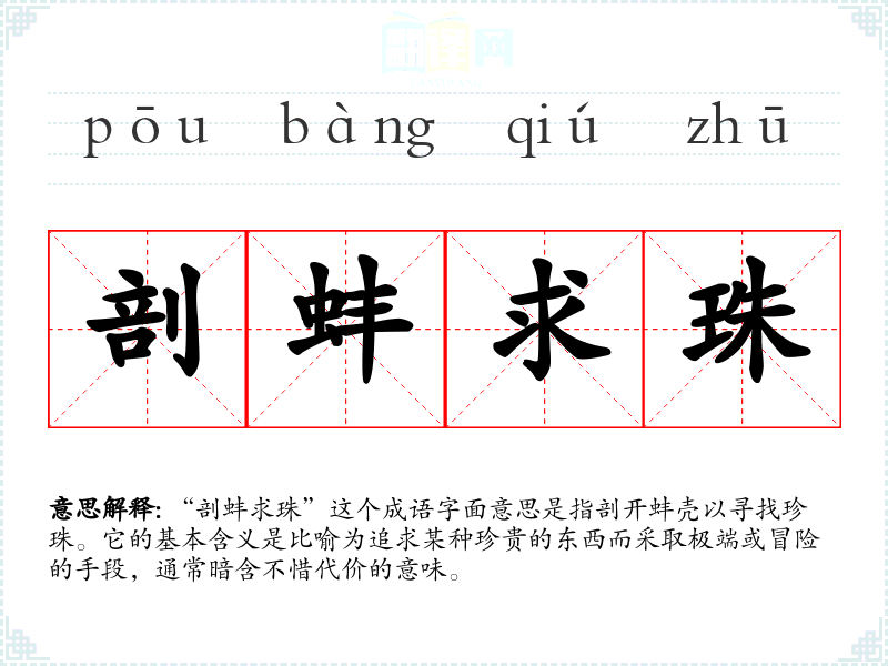 “剖蚌求珠”这个成语字面意思是指剖开蚌壳以寻找珍珠。它的基本含义是比喻为追求某种珍贵的东西而采取极端或冒险的手段,通常暗含不惜代价的意味。