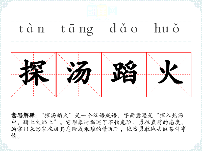 “探汤蹈火”是一个汉语成语,字面意思是“探入热汤中,踏上火焰上”。它形象地描述了不怕危险、勇往直前的态度,通常用来形容在极其危险或艰难的情况下,依然勇敢地去做某件事情。