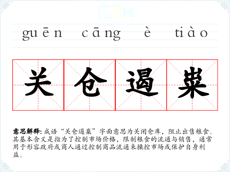 成语“关仓遏粜”字面意思为关闭仓库,阻止出售粮食。其基本含义是指为了控制市场价格,限制粮食的流通与销售,通常用于形容政府或商人通过控制商品流通来操控市场或保护自身利益。