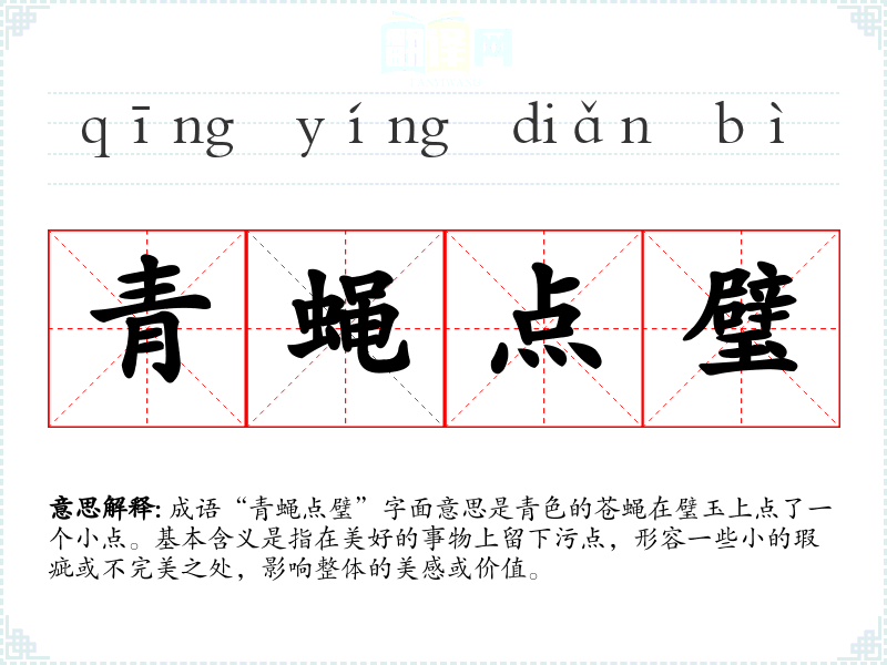 成语“青蝇点璧”字面意思是青色的苍蝇在璧玉上点了一个小点。基本含义是指在美好的事物上留下污点,形容一些小的瑕疵或不完美之处,影响整体的美感或价值。