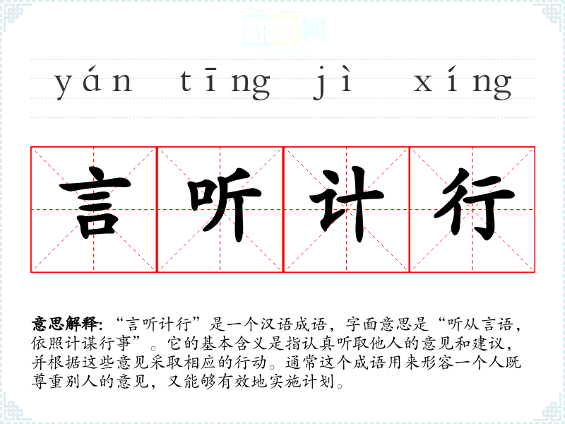 “言听计行”让我联想到有效沟通和团队合作的美好。它传递出一种尊重和理解的情感,也暗示着通过倾听与交流,可以实现更好的决策和行动。这种理念在我日常生活和工作中也有重要的指导意义。