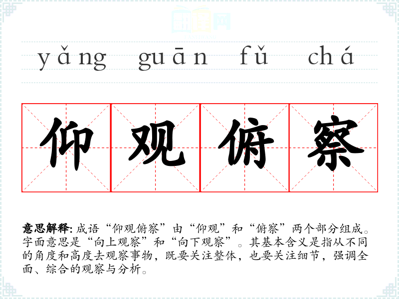 成语“仰观俯察”由“仰观”和“俯察”两个部分组成。字面意思是“向上观察”和“向下观察”。其基本含义是指从不同的角度和高度去观察事物,既要关注整体,也要关注细节,强调全面、综合的观察与分析。