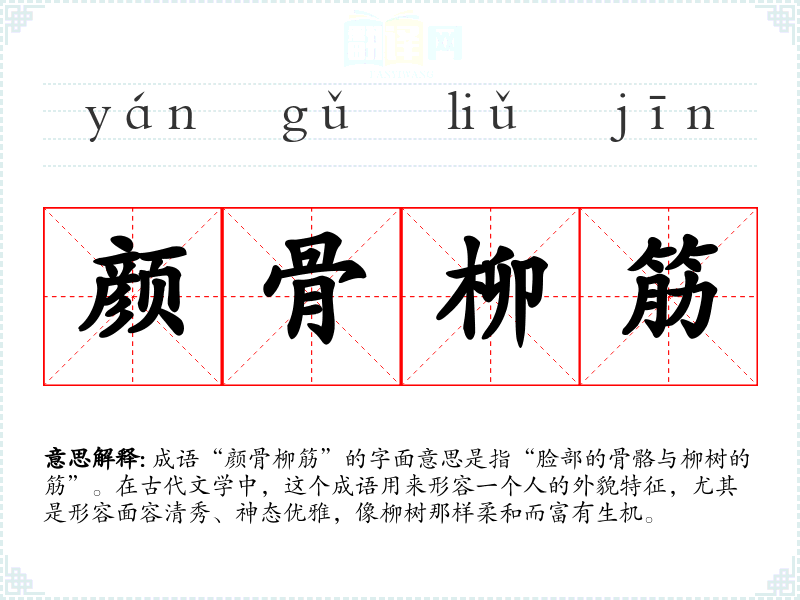成语“颜骨柳筋”的字面意思是指“脸部的骨骼与柳树的筋”。在古代文学中,这个成语用来形容一个人的外貌特征,尤其是形容面容清秀、神态优雅,像柳树那样柔和而富有生机。