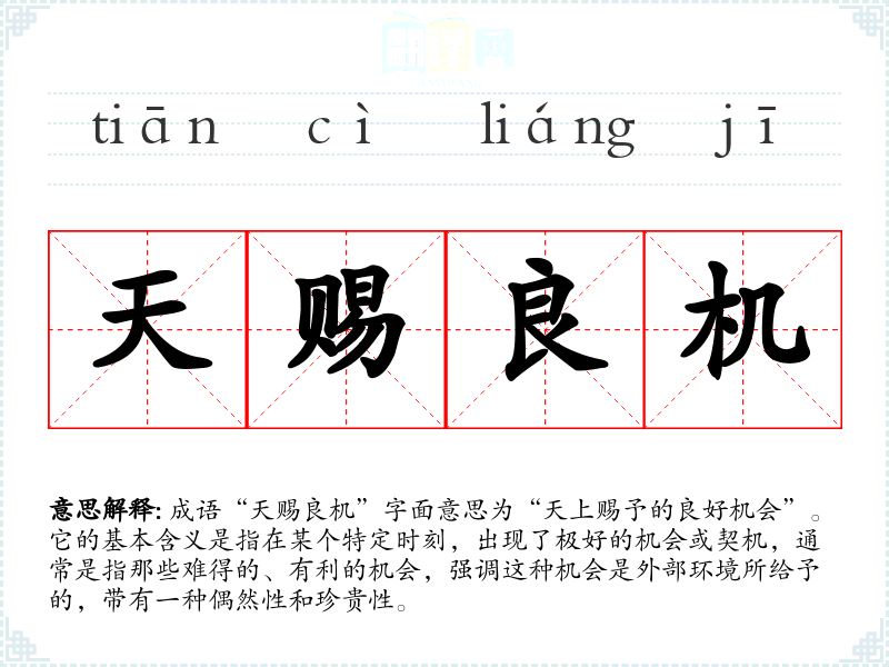 成语“天赐良机”字面意思为“天上赐予的良好机会”。它的基本含义是指在某个特定时刻,出现了极好的机会或契机,通常是指那些难得的、有利的机会,强调这种机会是外部环境所给予的,带有一种偶然性和珍贵性。
