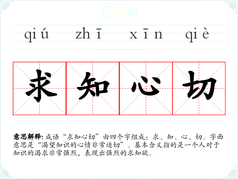 成语“求知心切”由四个字组成:求、知、心、切。字面意思是“渴望知识的心情非常迫切”。基本含义指的是一个人对于知识的渴求非常强烈,表现出强烈的求知欲。