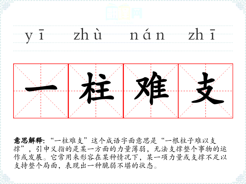“一柱难支”这个成语字面意思是“一根柱子难以支撑”,引申义指的是某一方面的力量*弱,无法支撑整个事物的运作或发展。它常用来形容在某种情况下,某一项力量或支撑不足以支持整个局面,表现出一种脆弱不堪的状态。