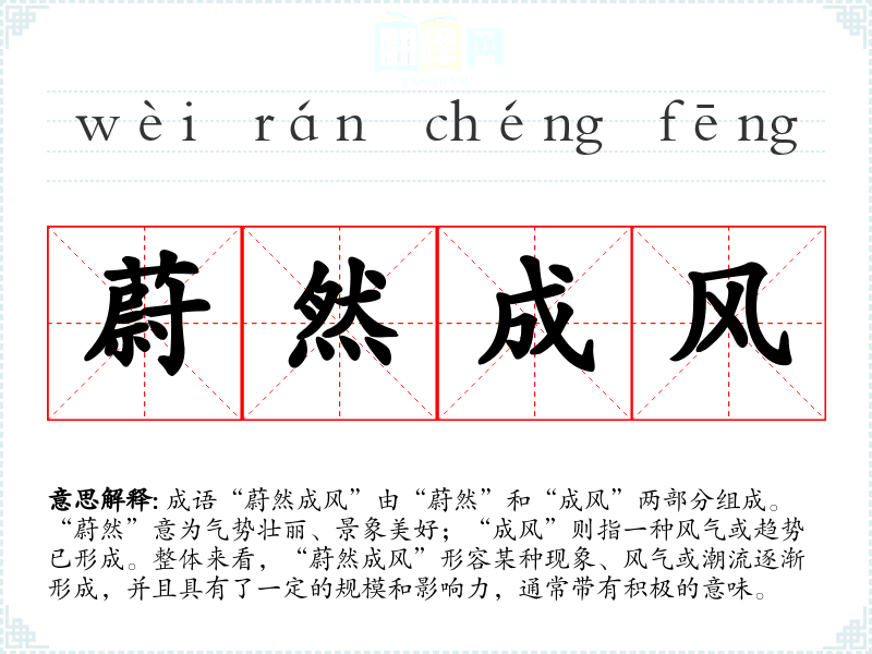 成语“蔚然成风”由“蔚然”和“成风”两部分组成。“蔚然”意为气势壮丽、景象美好;“成风”则指一种风气或趋势已形成。整体来看,“蔚然成风”形容某种现象、风气或潮流逐渐形成,并且具有了一定的规模和影响力,通常带有积极的意味。