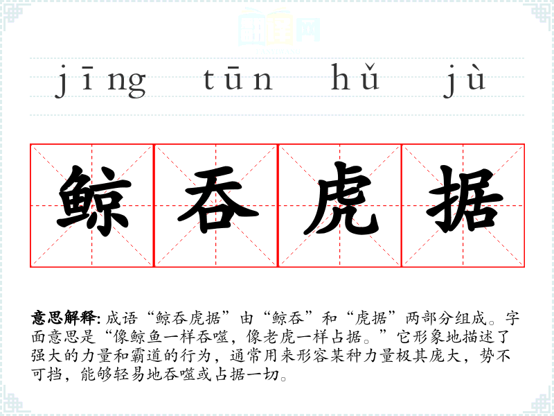 成语“鲸吞虎据”由“鲸吞”和“虎据”两部分组成。字面意思是“像鲸鱼一样吞噬,像**一样占据。”它形象地描述了强大的力量和霸道的行为,通常用来形容某种力量极其庞大,势不可挡,能够轻易地吞噬或占据一切。