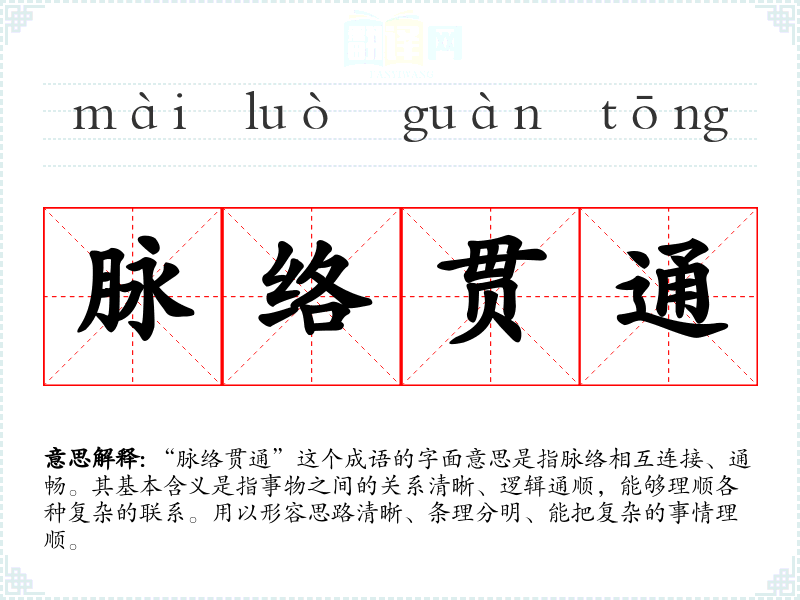 “脉络贯通”这个成语的字面意思是指脉络相互连接、通畅。其基本含义是指事物之间的关系清晰、逻辑通顺,能够理顺各种复杂的联系。用以形容思路清晰、条理分明、能把复杂的事情理顺。