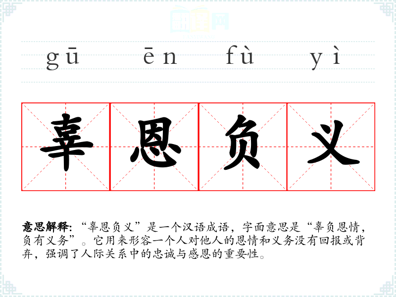 “辜恩负义”是一个汉语成语,字面意思是“辜负恩情,负有义务”。它用来形容一个人对他人的恩情和义务没有回报或背弃,强调了人际关系中的忠诚与感恩的重要性。