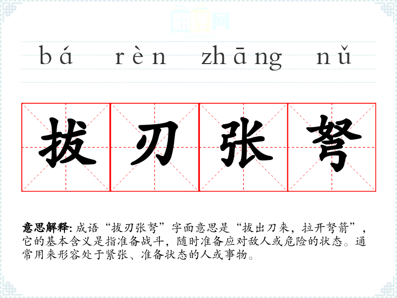 成语“拔刃张弩”字面意思是“拔出刀来,拉开弩箭”,它的基本含义是指准备战斗,随时准备应对敌人或危险的状态。通常用来形容处于紧张、准备状态的人或事物。
