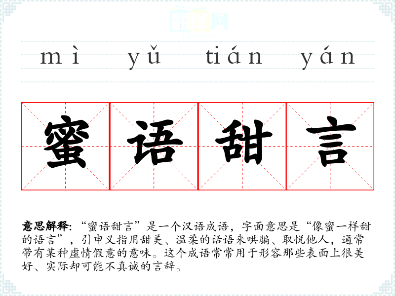 “蜜语甜言”是一个汉语成语,字面意思是“像蜜一样甜的语言”,引申义指用甜美、温柔的话语来哄骗、取悦他人,通常带有某种虚情假意的意味。这个成语常常用于形容那些表面上很美好、实际却可能不真诚的言辞。
