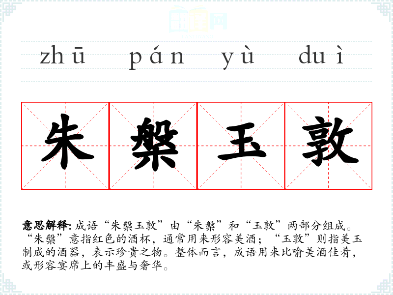 成语“朱槃玉敦”由“朱槃”和“玉敦”两部分组成。“朱槃”意指红色的酒杯,通常用来形容美酒;“玉敦”则指美玉制成的酒器,表示珍贵之物。整体而言,成语用来比喻美酒佳肴,或形容宴席上的丰盛与奢华。