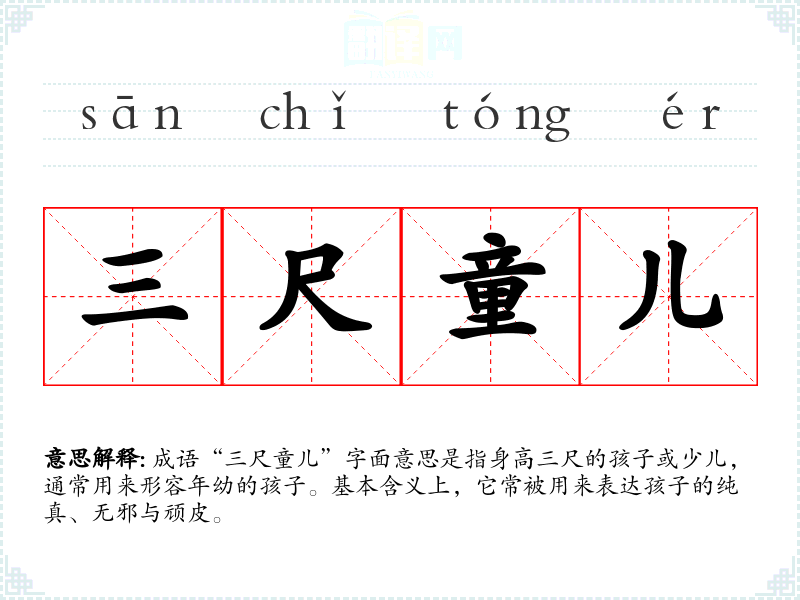 成语“三尺童儿”字面意思是指身高三尺的孩子或少儿,通常用来形容年幼的孩子。基本含义上,它常被用来表达孩子的纯真、无邪与顽皮。