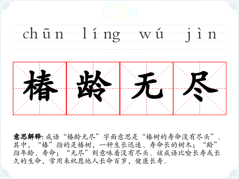 “椿龄无尽”出自古代文献,其具体的出处可能不易考证,但类似的表达在古代文人墨客的诗歌中时常出现。椿树在**文化中被视为长寿的象征,因此这一成语的使用可能与古人对自然界的观察和对长寿的向往有关。