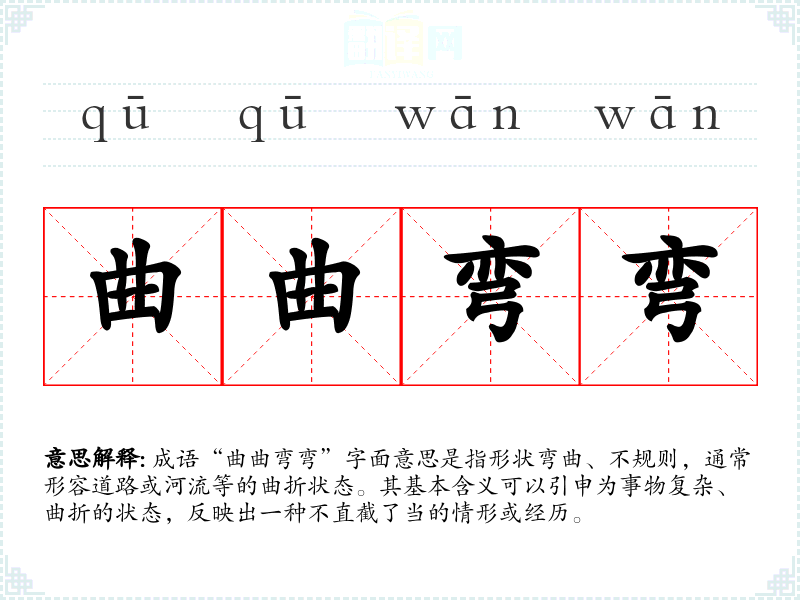 成语“曲曲弯弯”字面意思是指形状弯曲、不规则,通常形容道路或河流等的曲折状态。其基本含义可以引申为事物复杂、曲折的状态,反映出一种不直截了当的情形或经历。