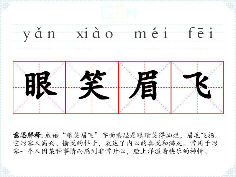 - 喜形于色:形容喜悦的情绪显现在脸上,和“眼笑眉飞”意思相近。