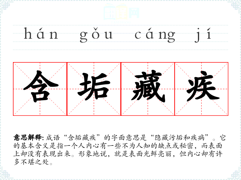 成语“含垢藏疾”的字面意思是“隐藏污垢和疾病”。它的基本含义是指一个人内心有一些不为人知的缺点或秘密,而表面上却没有表现出来。形象地说,就是表面光鲜亮丽,但内心却有许多不堪之处。