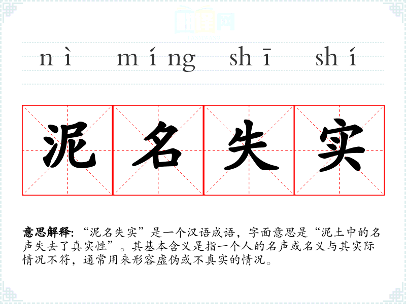 “泥名失实”是一个汉语成语,字面意思是“泥土中的名声失去了真实性”。其基本含义是指一个人的名声或名义与其实际情况不符,通常用来形容虚伪或不真实的情况。