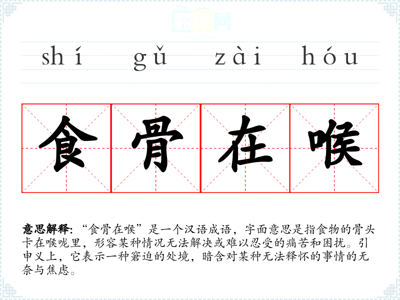 “食骨在喉”是一个汉语成语,字面意思是指食物的骨头卡在喉咙里,形容某种情况无法解决或难以忍受的痛苦和困扰。引申义上,它表示一种窘迫的处境,暗含对某种无法释怀的事情的无奈与焦虑。