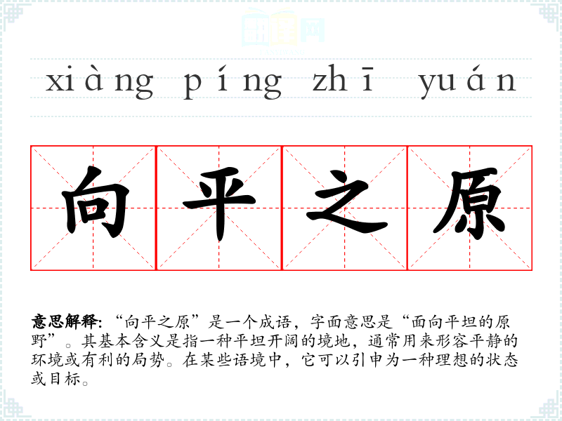 “向平之原”是一个成语,字面意思是“面向平坦的原野”。其基本含义是指一种平坦开阔的境地,通常用来形容平静的环境或有利的局势。在某些语境中,它可以引申为一种理想的状态或目标。