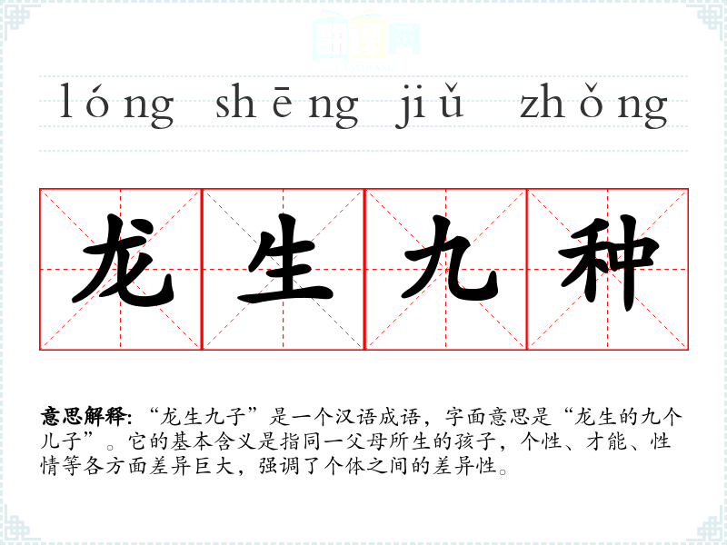 “龙生九子”是一个汉语成语,字面意思是“龙生的九个儿子”。它的基本含义是指同一父母所生的孩子,个性、才能、性情等各方面差异巨大,强调了个体之间的差异性。