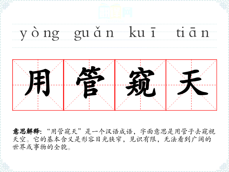 | 以管窥天 | 管:竹管;窥:从小孔或缝隙里看。通过竹管子的孔看天。比喻见闻狭隘或看事片面。 |