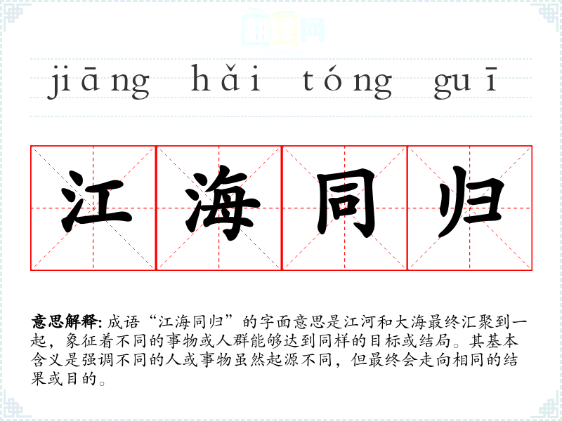 成语“江海同归”的字面意思是江河和大海最终汇聚到一起,象征着不同的事物或人群能够达到同样的目标或结局。其基本含义是强调不同的人或事物虽然起源不同,但最终会走向相同的结果或目的。