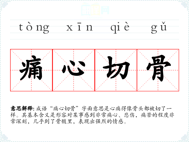 成语“痛心切骨”字面意思是心痛得像骨头都被切了一样。其基本含义是形容对某事感到非常痛心、悲伤,痛苦的程度非常深刻,几乎到了骨髓里,表现出强烈的情感。
