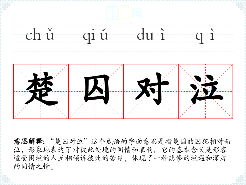 “楚囚对泣”这个成语的字面意思是指楚国的囚犯相对而泣,形象地表达了对彼此处境的同情和哀伤。它的基本含义是形容遭受困境的人互相倾诉彼此的苦楚,体现了一种悲惨的境遇和深厚的同情之情。