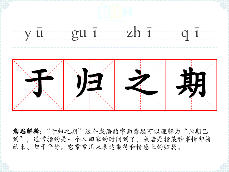 “于归之期”这个成语的字面意思可以理解为“归期已到”,通常指的是一个人回家的时间到了,或者是指某种事情即将结束、归于平静。它常常用来表达期待和情感上的归属。