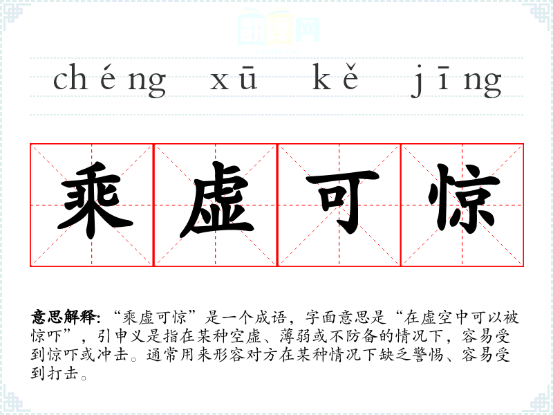 “乘虚可惊”出自《史记·李将军列传》,原文为“乘虚而入,击其无备”,意指在敌人虚弱、疏忽之时采取行动,给对方带来意外的惊吓和打击。这一成语强调了在敌人处于松懈状态时,采取行动的有效性。
