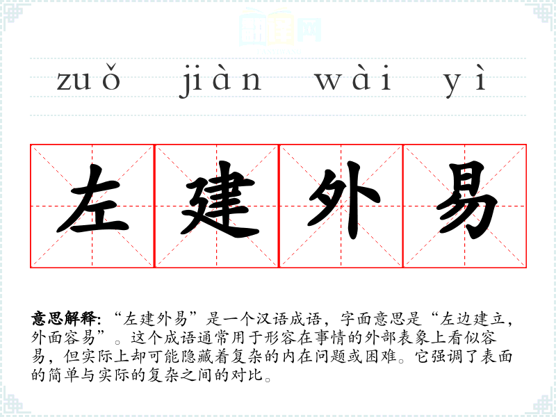 “左建外易”是一个汉语成语,字面意思是“左边建立,外面容易”。这个成语通常用于形容在事情的外部表象上看似容易,但实际上却可能隐藏着复杂的内在问题或困难。它强调了表面的简单与实际的复杂之间的对比。
