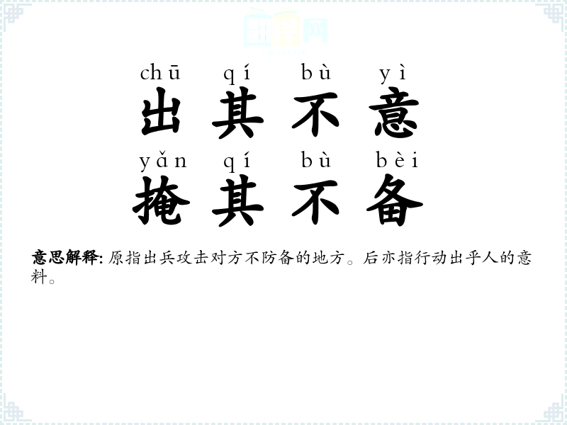 | 出其不意,掩其不备 | 原指出兵攻击对方不防备的地方。后亦指行动出乎人的意料。 |