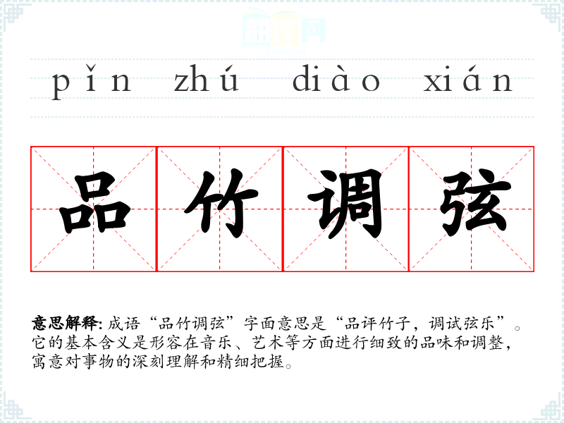 成语“品竹调弦”字面意思是“品评竹子,调试弦乐”。它的基本含义是形容在音乐、艺术等方面进行细致的品味和调整,寓意对事物的深刻理解和精细把握。