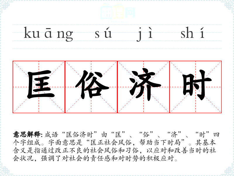 | 匡俗济时 | 匡:纠正;济:救助。拯救社会时局和风气,使之归于正道。 |