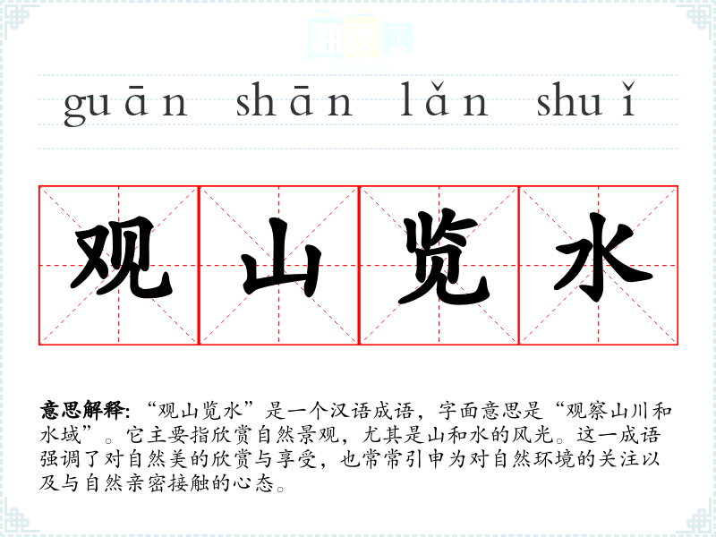 “观山览水”是一个汉语成语,字面意思是“观察山川和水域”。它主要指欣赏自然景观,尤其是山和水的风光。这一成语强调了对自然美的欣赏与享受,也常常引申为对自然环境的关注以及与自然亲密接触的心态。