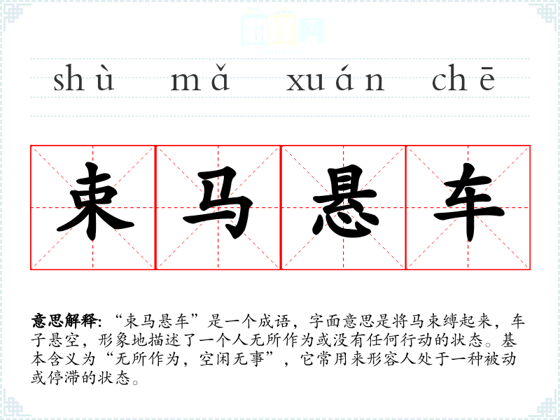 该成语源自《史记·封禅书》,其中提到“束马悬车,非无马也,非无车也,惟无所用耳”。这句话的意思是,虽然有马和车,但由于没有事情可做,所以马被束缚,车子也悬空,体现了对无所事事状态的描述。