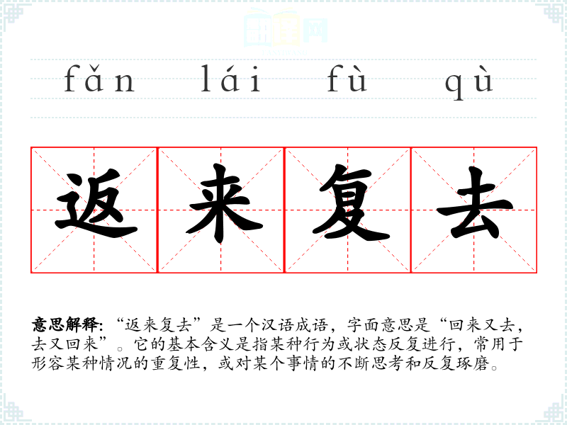 “返来复去”是一个汉语成语,字面意思是“回来又去,去又回来”。它的基本含义是指某种行为或状态反复进行,常用于形容某种情况的重复性,或对某个事情的不断思考和反复琢磨。