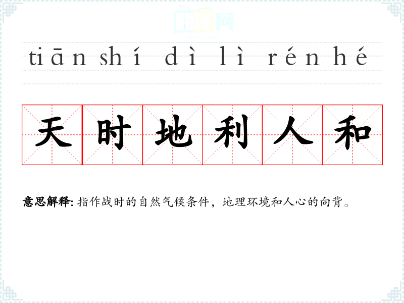 | 上得天时,下得地利 | 指作战既有适宜的气候条件,又有优越的地理形势作依托。也形容办事所具备的客观条件极为有利。 |