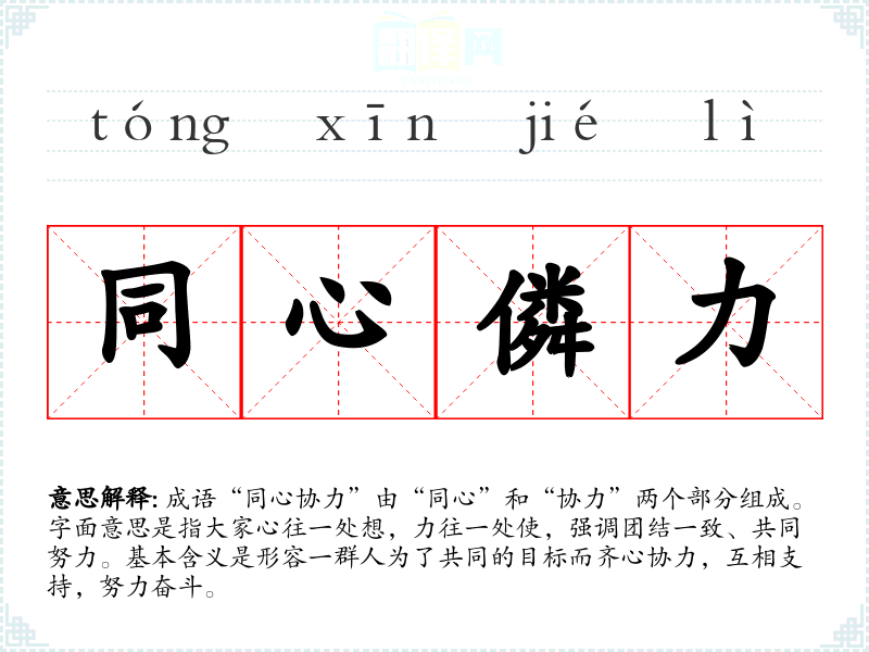成语“同心协力”由“同心”和“协力”两个部分组成。字面意思是指大家心往一处想,力往一处使,强调团结一致、共同努力。基本含义是形容一群人为了共同的目标而齐心协力,互相支持,努力奋斗。