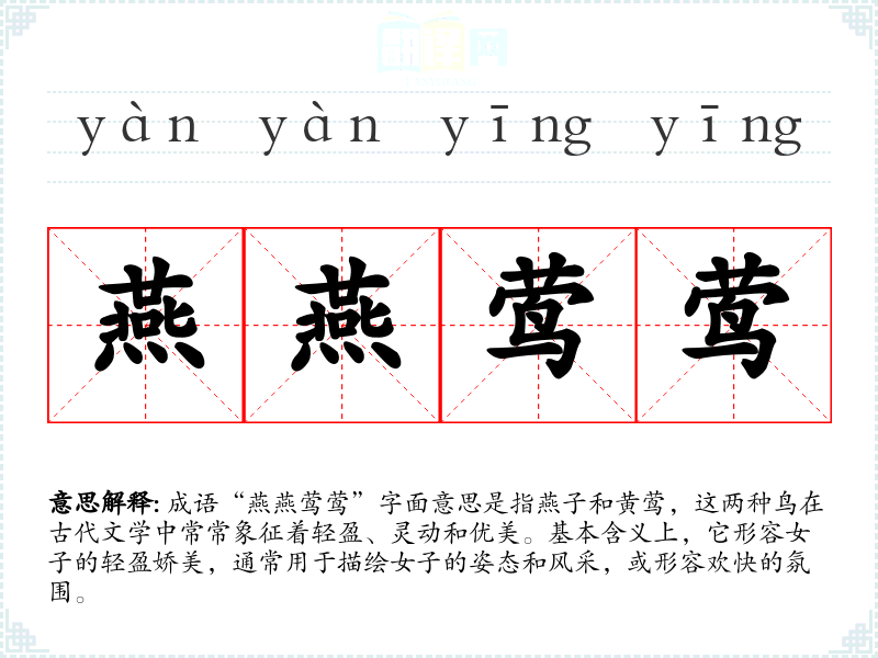 成语“燕燕莺莺”字面意思是指燕子和黄莺,这两种鸟在古代文学中常常象征着轻盈、灵动和优美。基本含义上,它形容女子的轻盈娇美,通常用于描绘女子的姿态和风采,或形容欢快的氛围。